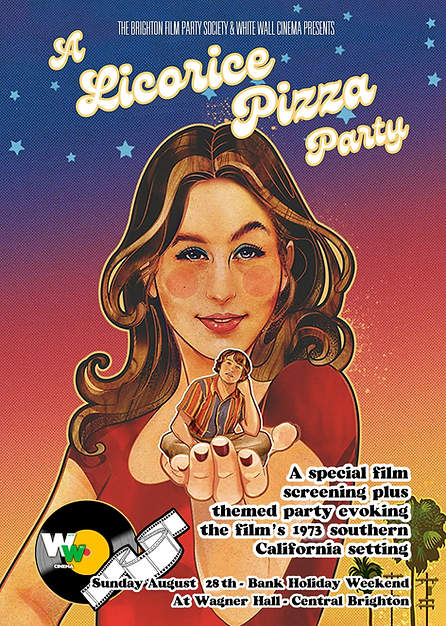 THE EVENT: Alongside a film screening White Wall Cinema welcomes the long awaited return of The Brighton Film Party Society (take a look at some of their previous work HERE). After an enforced hiatus the collective return for their first post-pandemic event as they provide set dressing and a soundtrack to bring to life the 1973 southern Californian setting from one of the best films of the year, Paul Thomas Anderson’s Licorice Pizza.